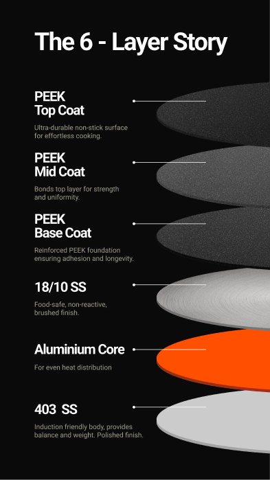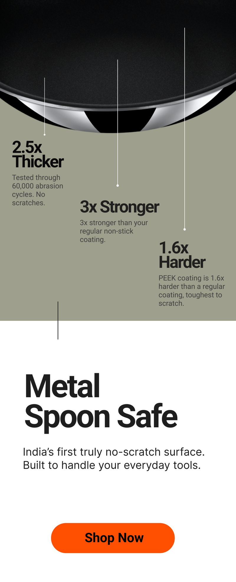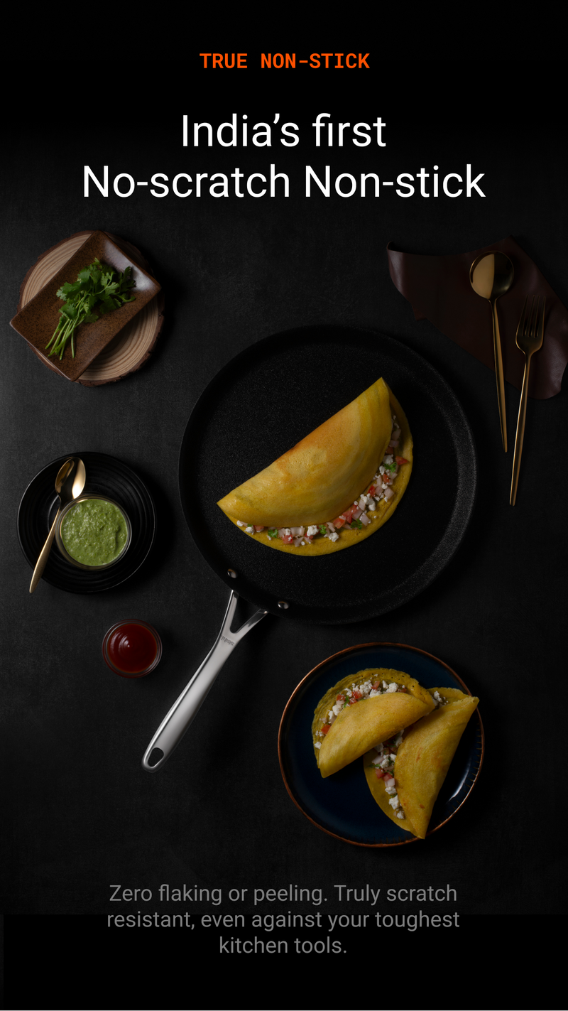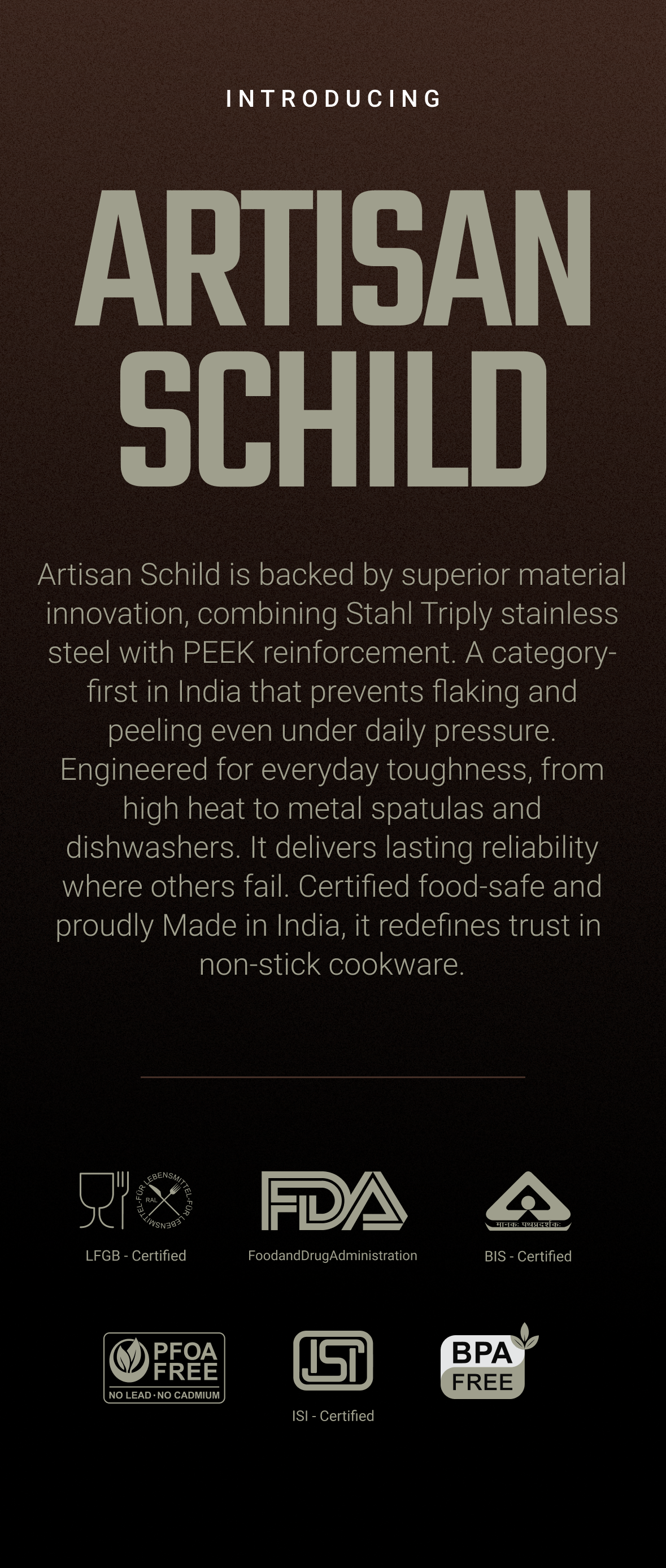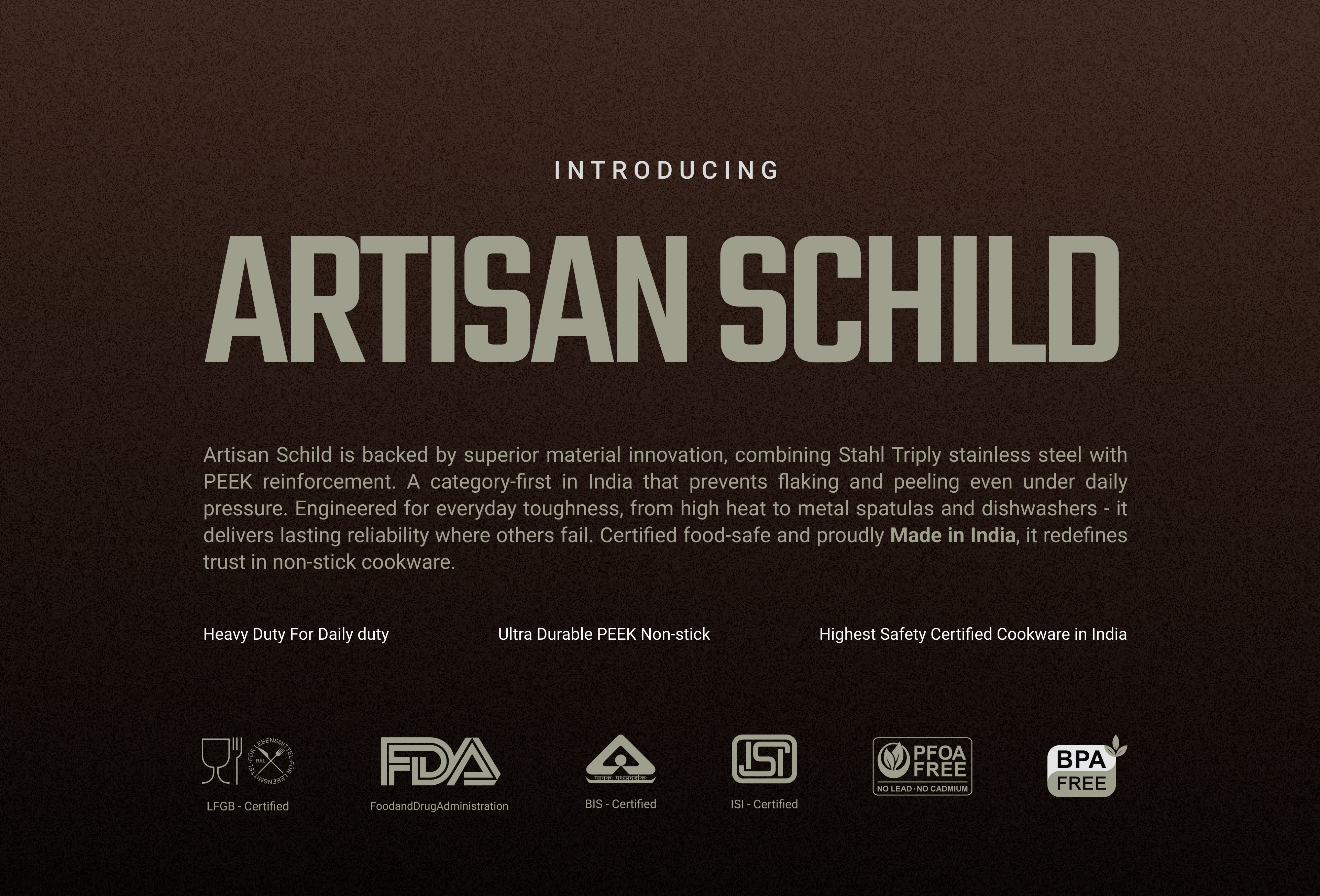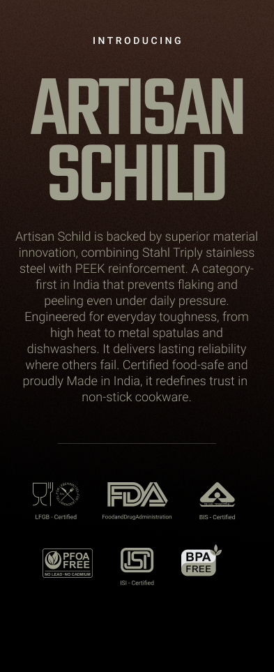 The Artisan Schild is India’s first no-scratch, PEEK-reinforced cookware range. It combines Triply stainless steel with PEEK performance technology, making it tougher, longer-lasting, and safer than traditional non-stick cookware.