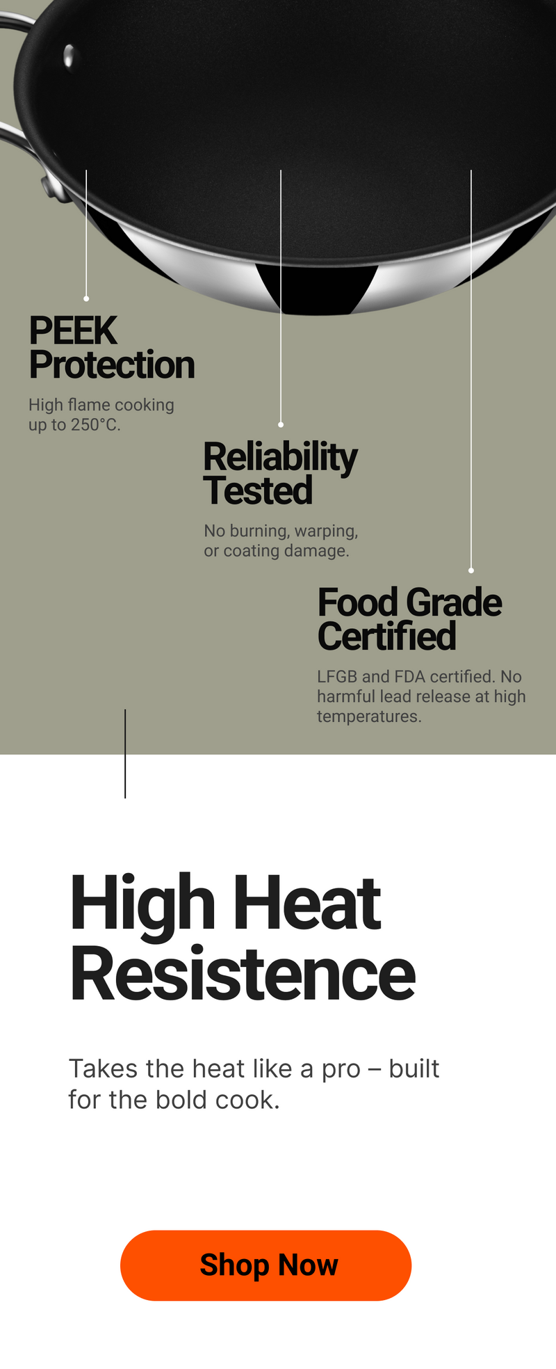 Yes. The 2.5x thicker PEEK surface prevents peeling or flaking and is 100% toxin-free with no PFOA, BPA, or heavy metals. It’s LFGB-certified, ensuring no metals like lead are released unlike regular non-stick at high temperatures.